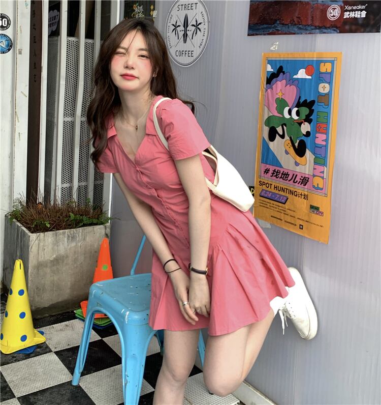 Vネック薄手Aラインシャツ スカート サマースリムプリーツドレス レッド 夏物 ピュア kumikum6522873861