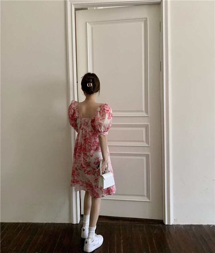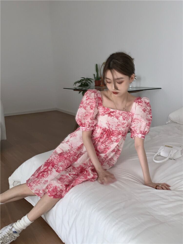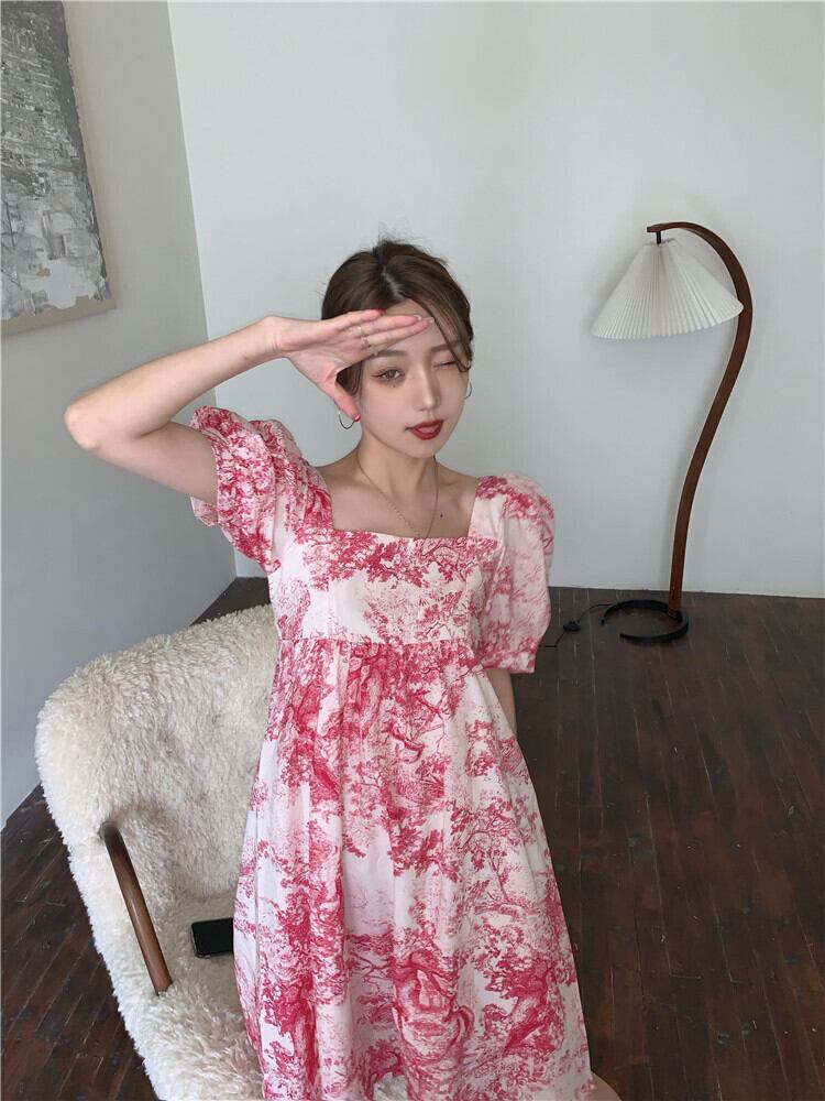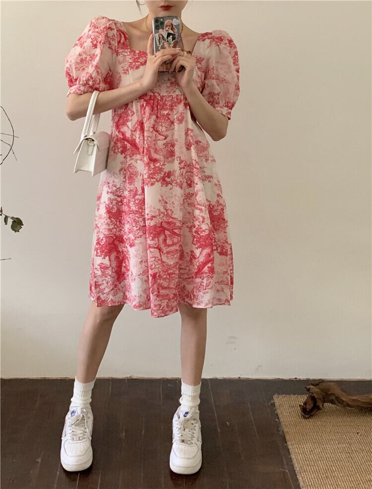 スタイルスタンダードプリント柄スリーブドレス サマーカラールーズ薄手スカート レトロ レース 夏物 スクウェア kumikum93533361241