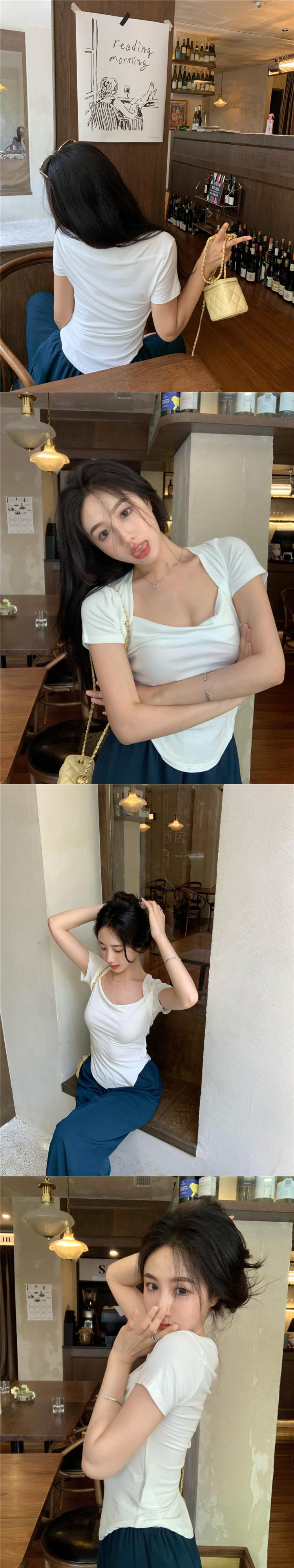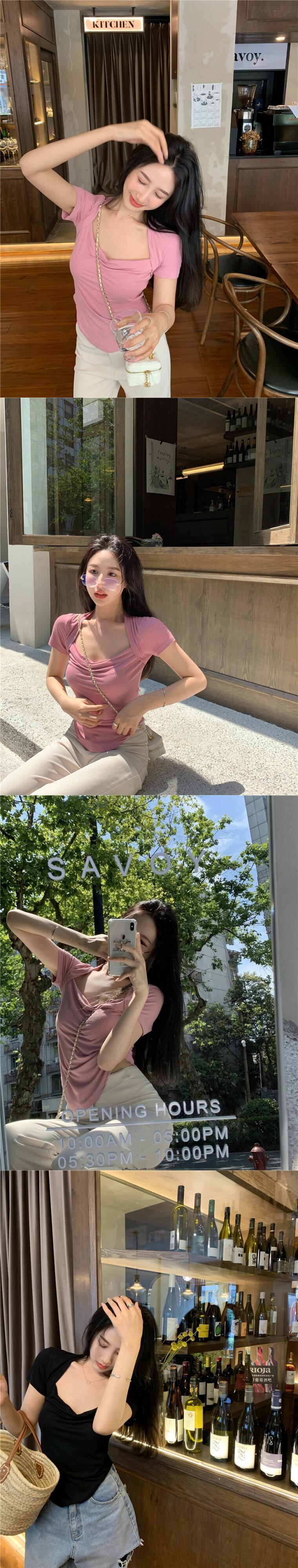 ブラックシャツ レディーススリムショートTシャツ サマートップス 夏物 スクウェア kumikum25556820423