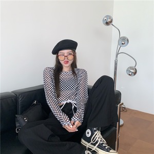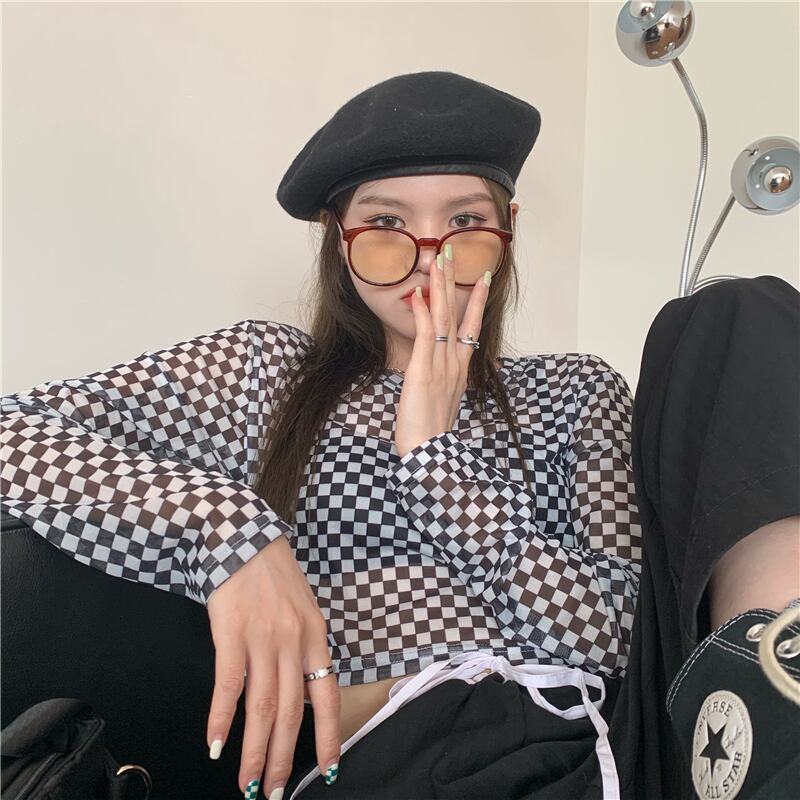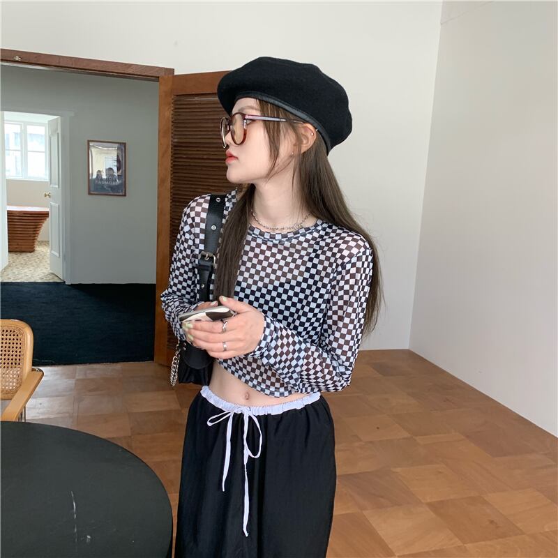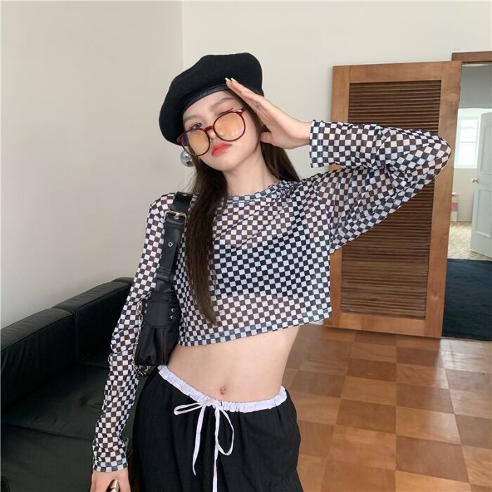 スタンダード薄手メッシュシャツ サマーショート格子柄Tシャツ レディース ロング レトロ 夏物 kumikum48636405838