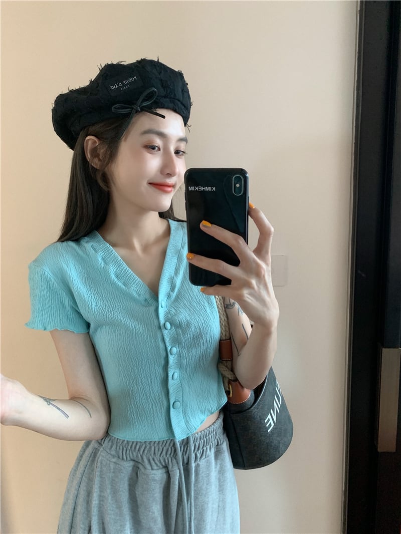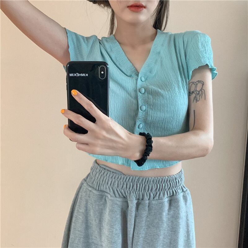 スタイルショートカーディガンTシャツ サマーVネック薄手プリーツトップス 夏物 kumikum25171041138