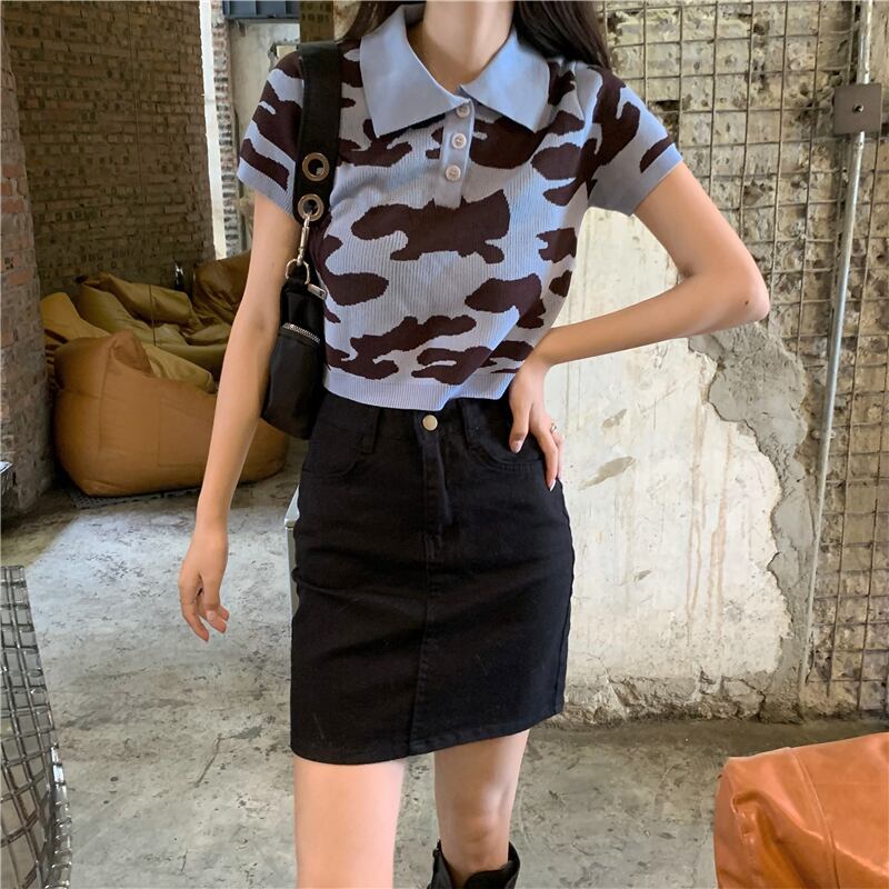 サマーパターンショートニットセーター カラースリムトップス 夏物 kumikum76625786894