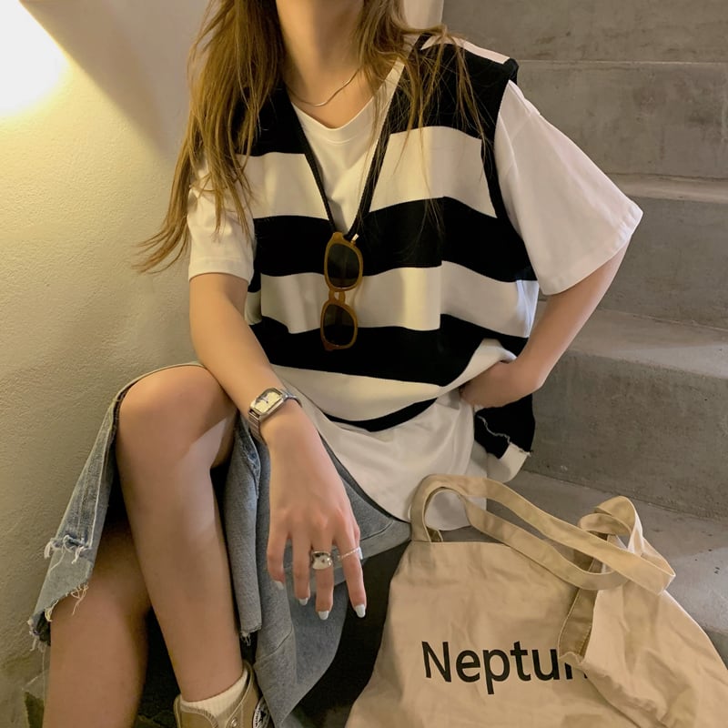 スタイルVネックストライプルーズ薄手ニットレディースサマートップス 夏物 kumikum39475209510