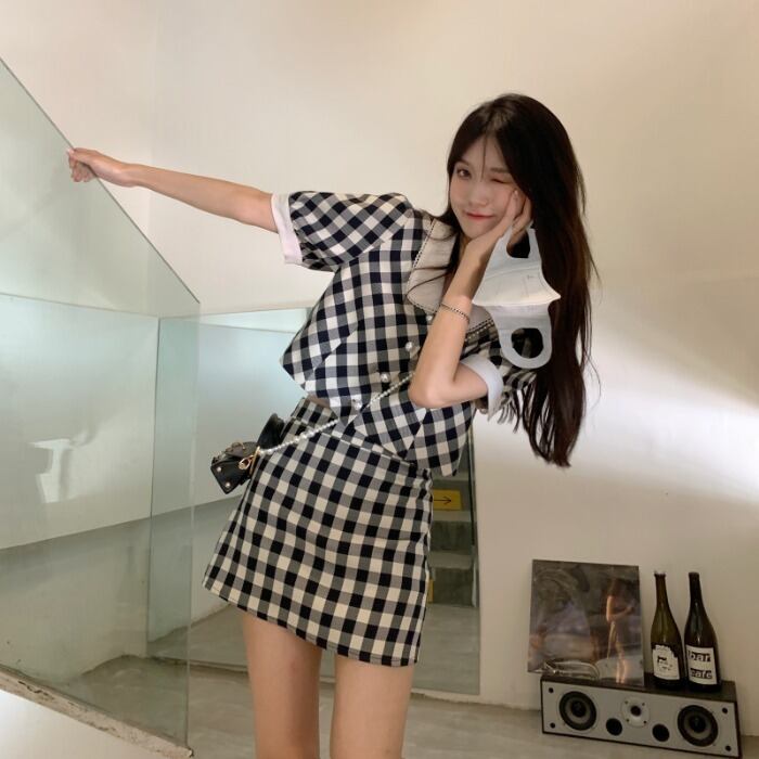 スタイルサマー格子柄トップス ハイウェストウェストAラインスカート 夏物 kumikum87566460635
