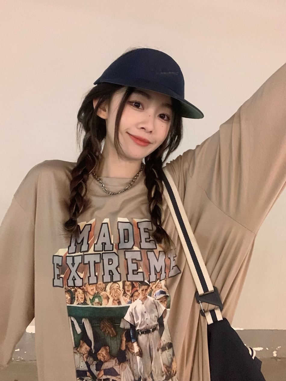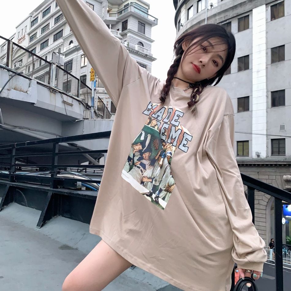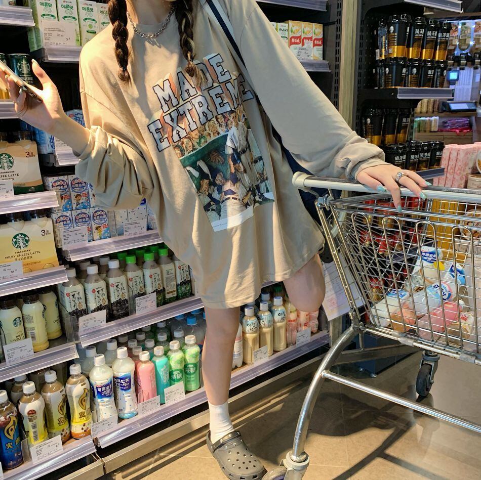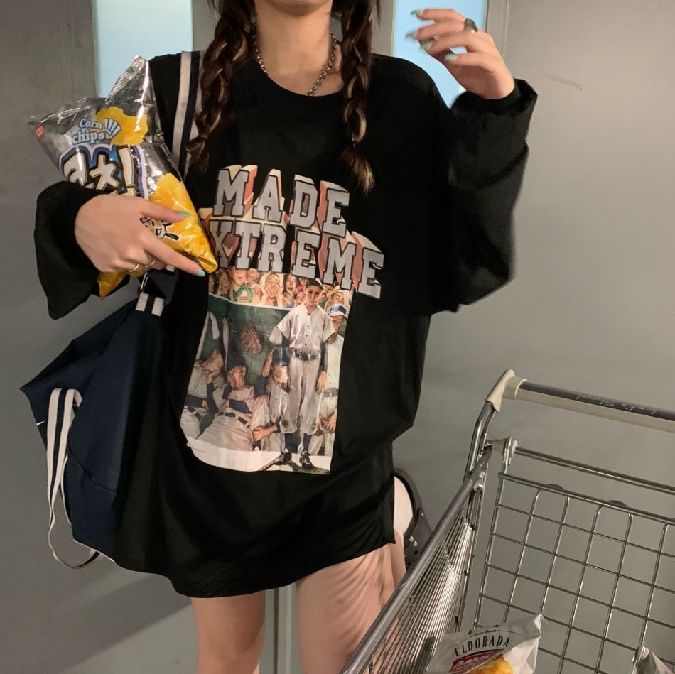 スタンダードプリント柄薄手ルーズTシャツ レディースサマートップス ロング レトロ 夏物 kumikum53059301158