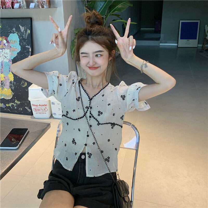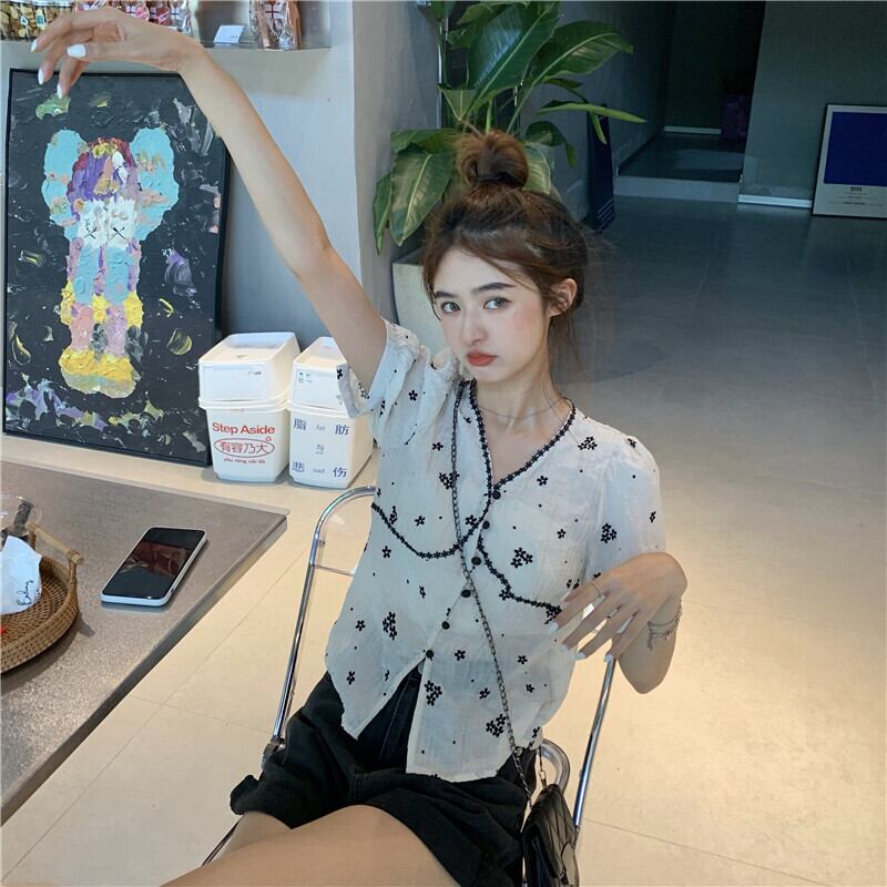Vネックフローラルスリーブシャツ サマースタイル薄手半袖トップス ショート ハーフスリーブ 夏物 花柄 kumikum38488325353