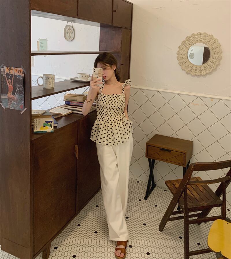 水玉レディースサマースタンダードウェストノースリーブトップス レトロ 夏物 kumikum33096784498