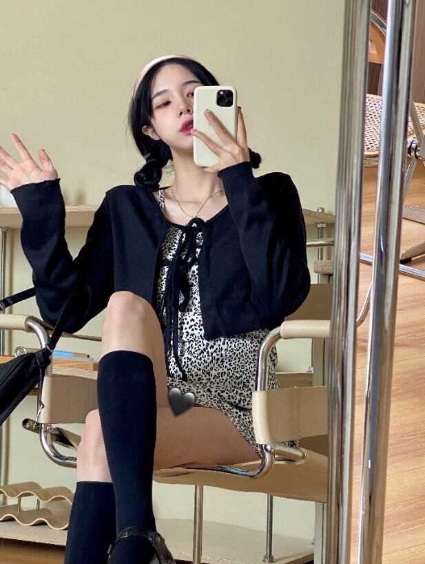 色:ヒョウ柄の小さなスリング,ヒョウ柄キャミソール,黒の半袖カーディガン,黒の長袖カーディガン,ブラックデニムショーツ