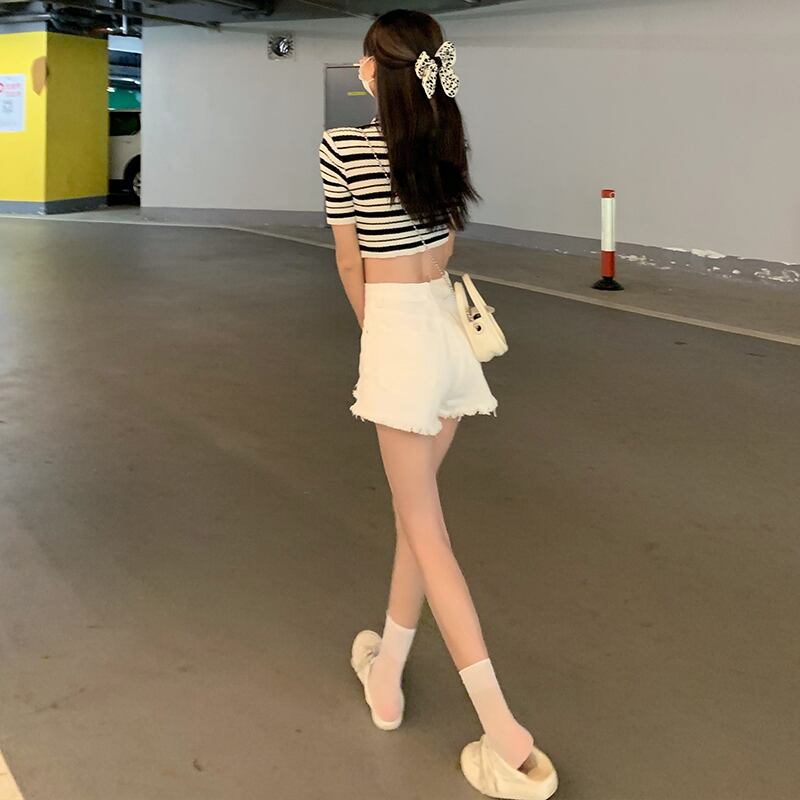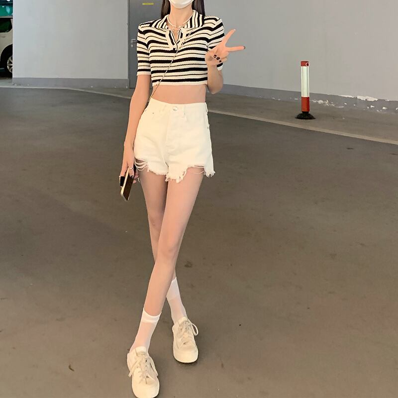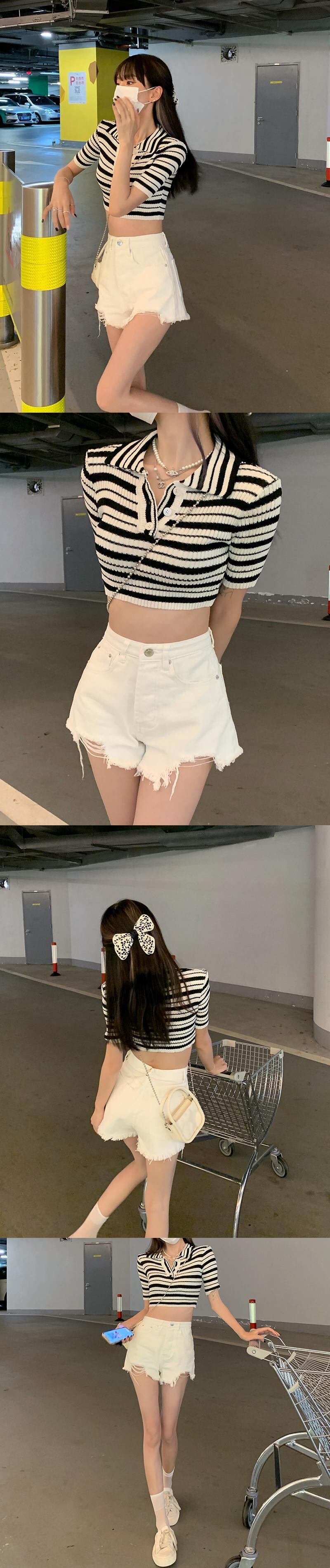 色:ホワイトデニムショートパンツ9509,ブラックデニムショートパンツ9509,ストライプトップ28051,刺繡トップ11586