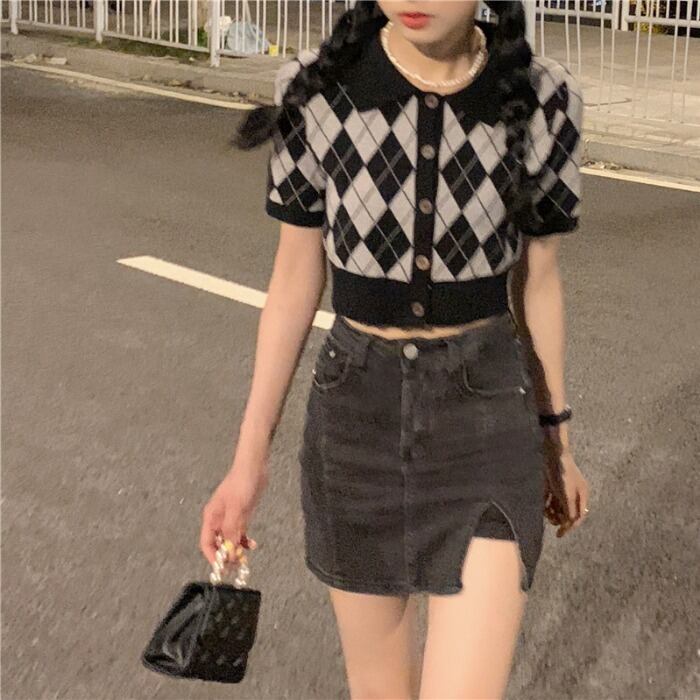 スタンダード格子柄ニット サマースリム半袖スリーブトップス カーディガンレディース ショート レトロ ハーフスリーブ 夏物 kumikum39902472212