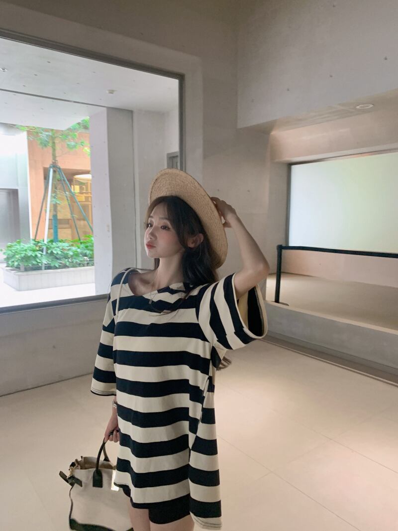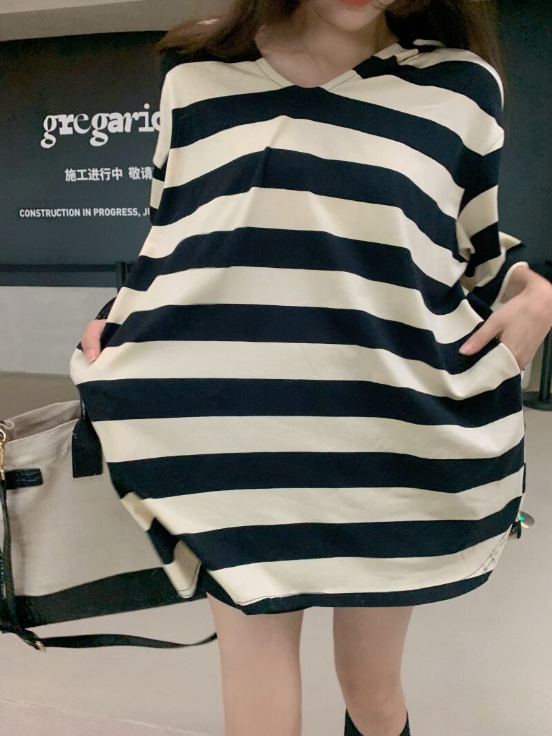 フードシャツ レディースサマーロングスタンダードストライプTシャツ ルーズカジュアルトップス レトロ 夏物 kumikum31235641851