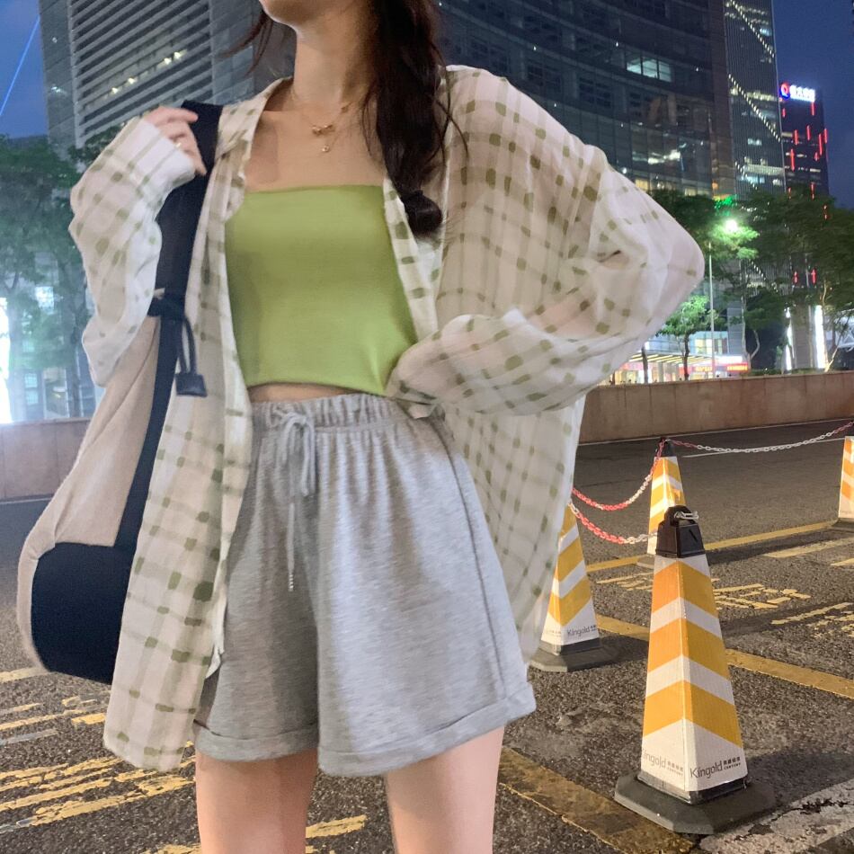 色:緑の胸ラップ,ダークブルーの胸ラップ,グレーのショートパンツ,緑の格子縞のシャツ,青い格子縞のシャツ