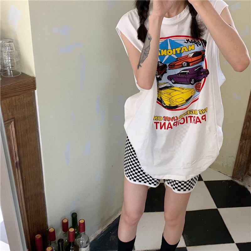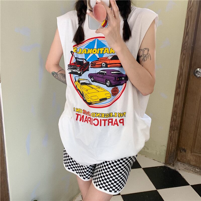 ホワイトノースリーブTシャツ サマースタイルロングルーズプリント柄トップス かわいい 夏物 kumikum11892116703