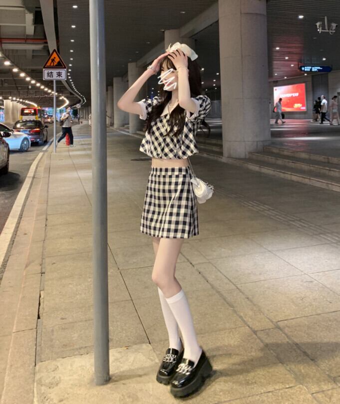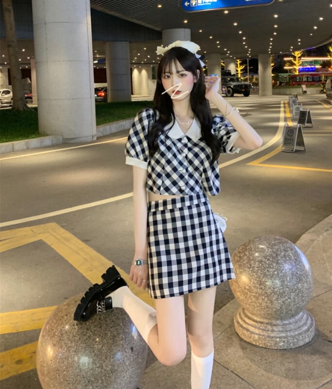 サマーショートトップス 格子柄スカート 大人ガーリー スウィート キュート カジュアル 夏物 kumikum41487663765
