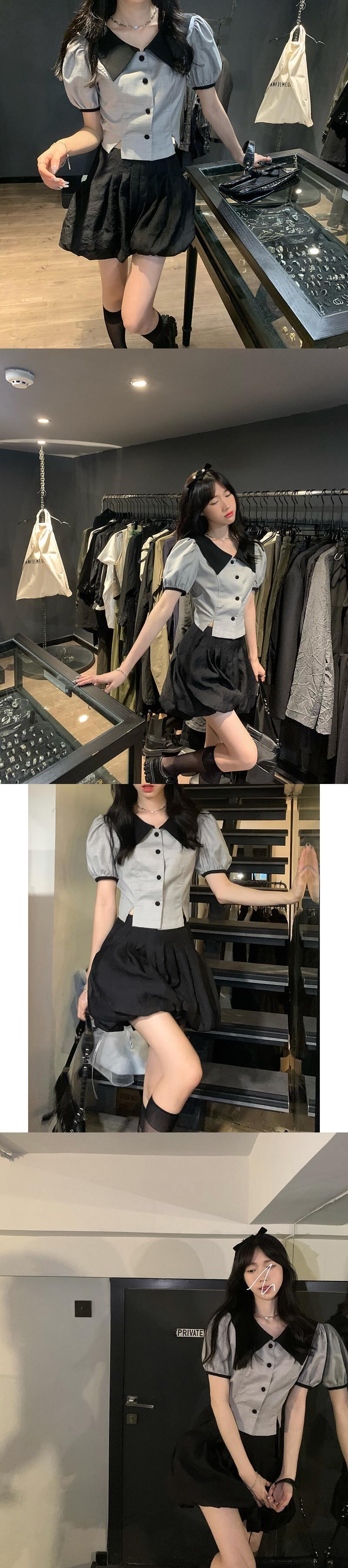 スタンダード薄手スリーブシャツ サマーハイウェストウェストスカート レトロ 夏物 kumikum86111168086