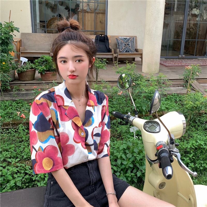 スタンダードプリント柄薄手シャツ サマーVネックトップス レディース レトロ 夏物 kumikum24317819677