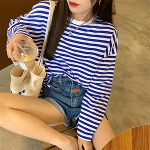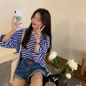 ベーシックストライプルーズトップス レディースサマーラウンドネック薄手長袖スリーブTシャツ ロング 夏物 Oネック kumikum2046921304