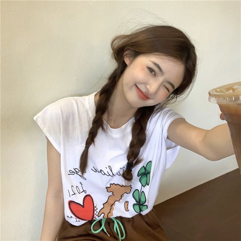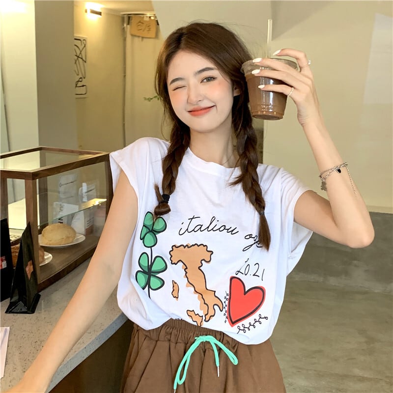 プリント柄ラウンドネックノースリーブTシャツ レディースサマールーズブラウス 夏物 Oネック kumikum41229214741