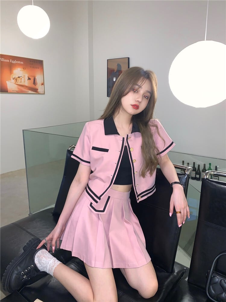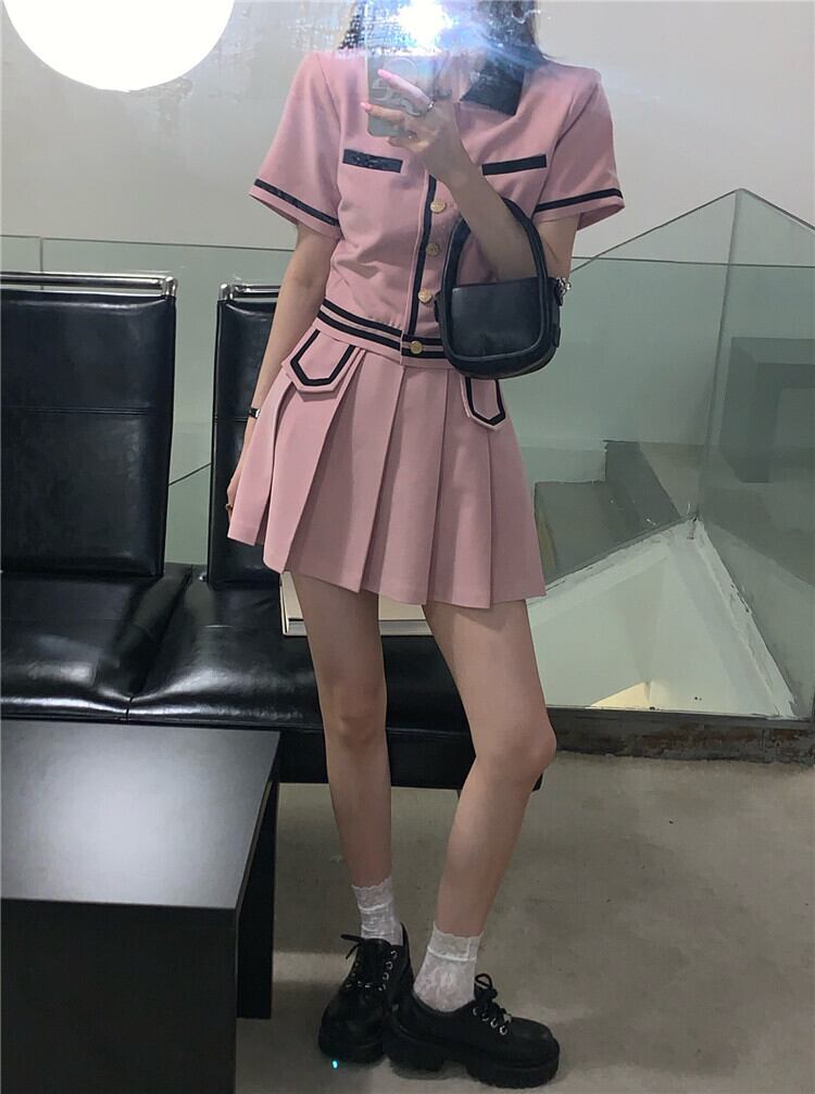 レッドレディースサマーカーディガンシャツ ハイウェストウェストプリーツスカート 夏物 kumikum7900966105