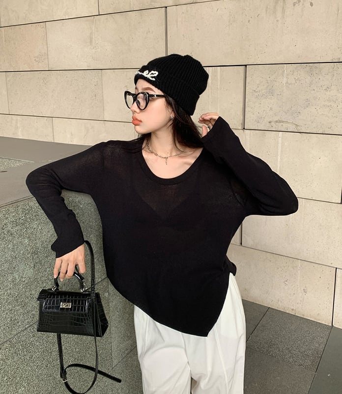 シャツ ソリッド カラーニットオータムラウンドネック ロング 秋物 Oネック ソリッドカラー kumikum20264320576