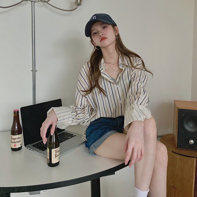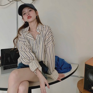 ルーズストライプシャツ オータム薄手カジュアルスタンダードコート ジャケット レディース ロング レトロ 秋物 kumikum73480715426