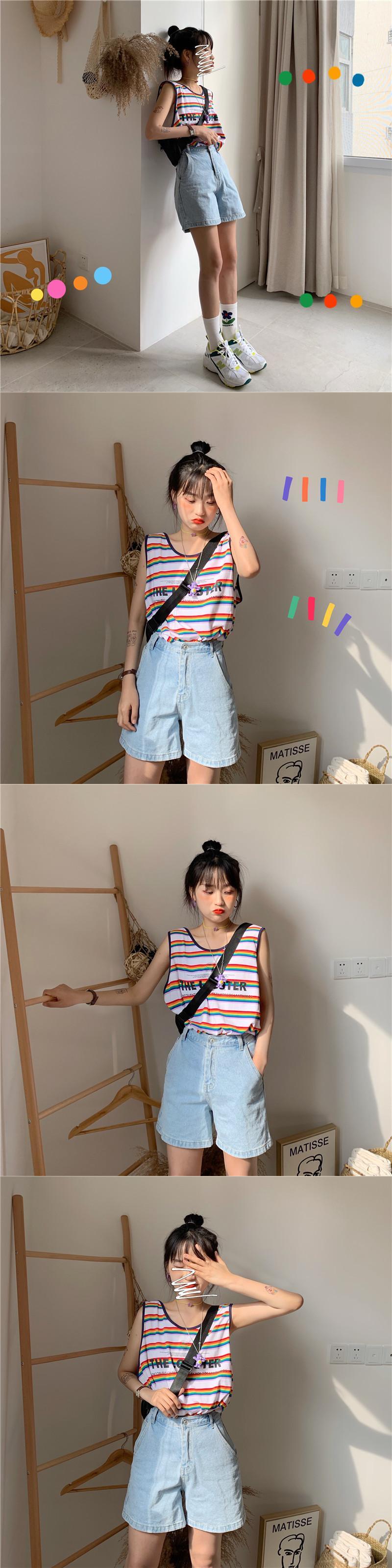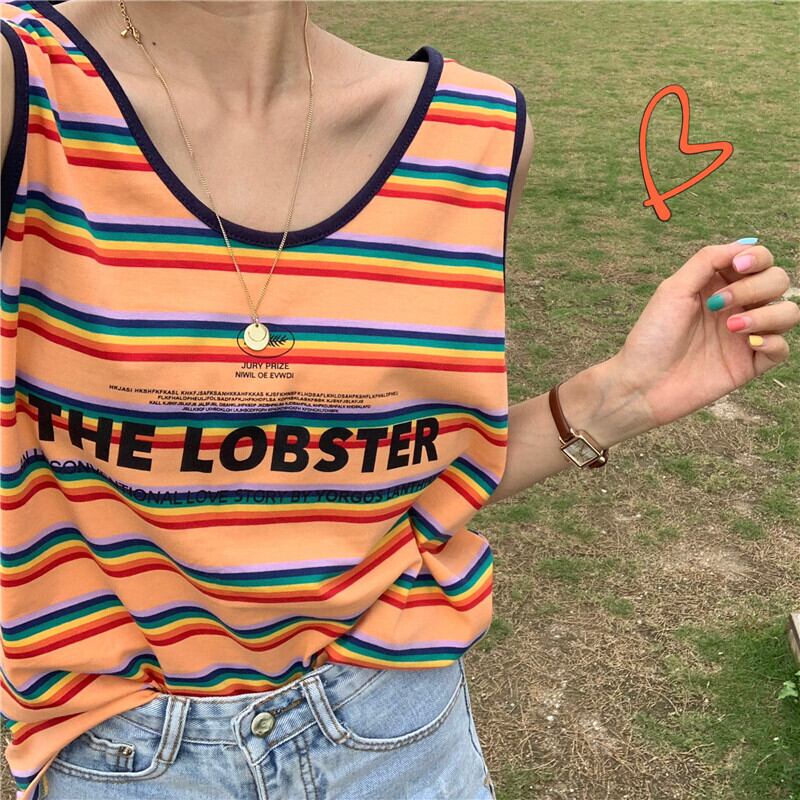 レッドカラーストライププリントラウンドネックサマールーズトップス 夏物 Oネック kumikum16027966567