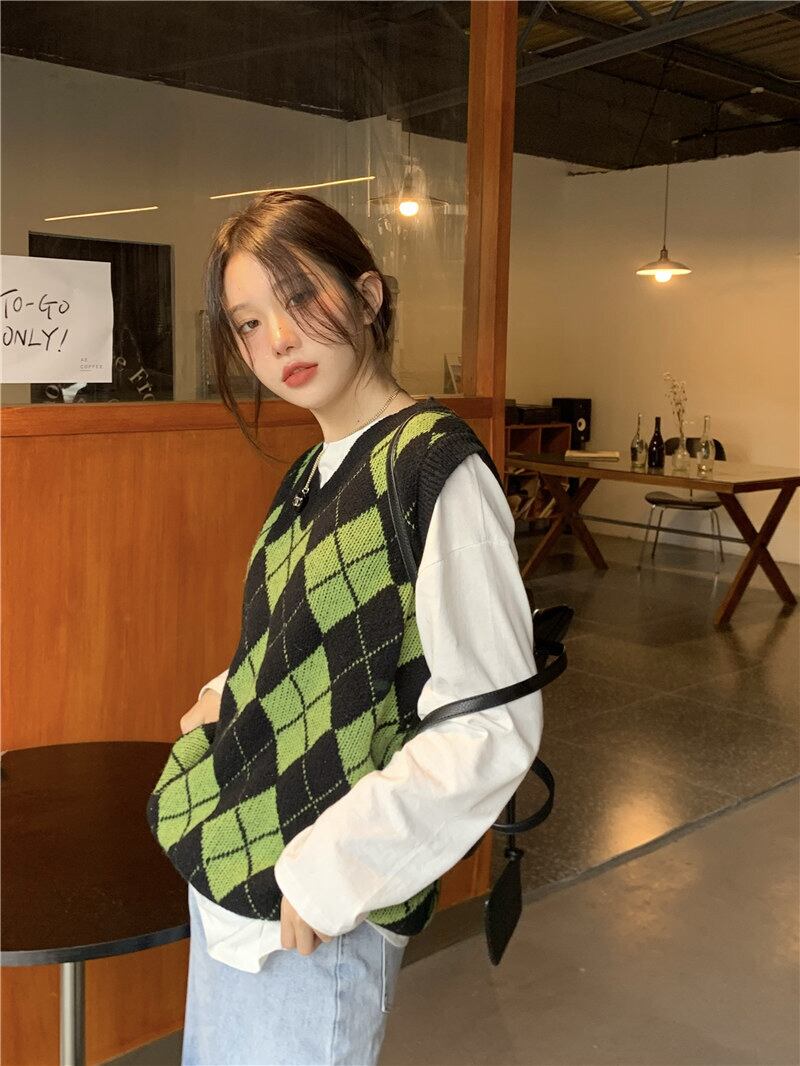 ニットスタイルノースリーブセーター オータムVネックスタンダード レトロ 秋物 kumikum59191632585