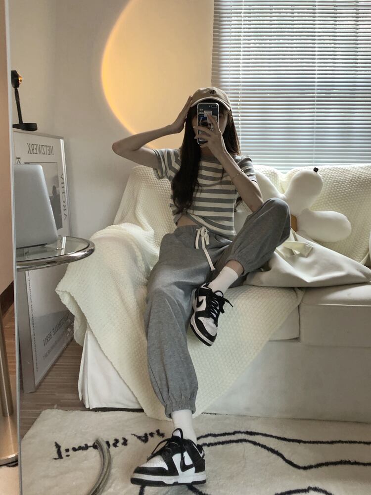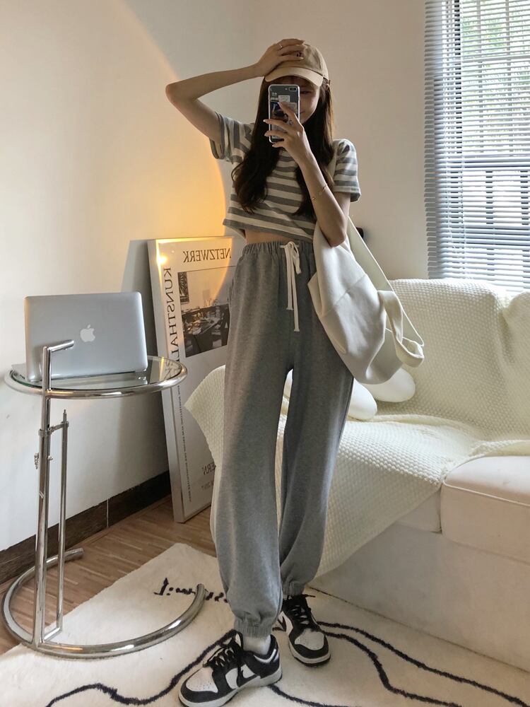 レディースサマーショートストライプトップス ストレッチウェストギャザーグレーパンツ エラスティック 伸縮 夏物 kumikum56027818655