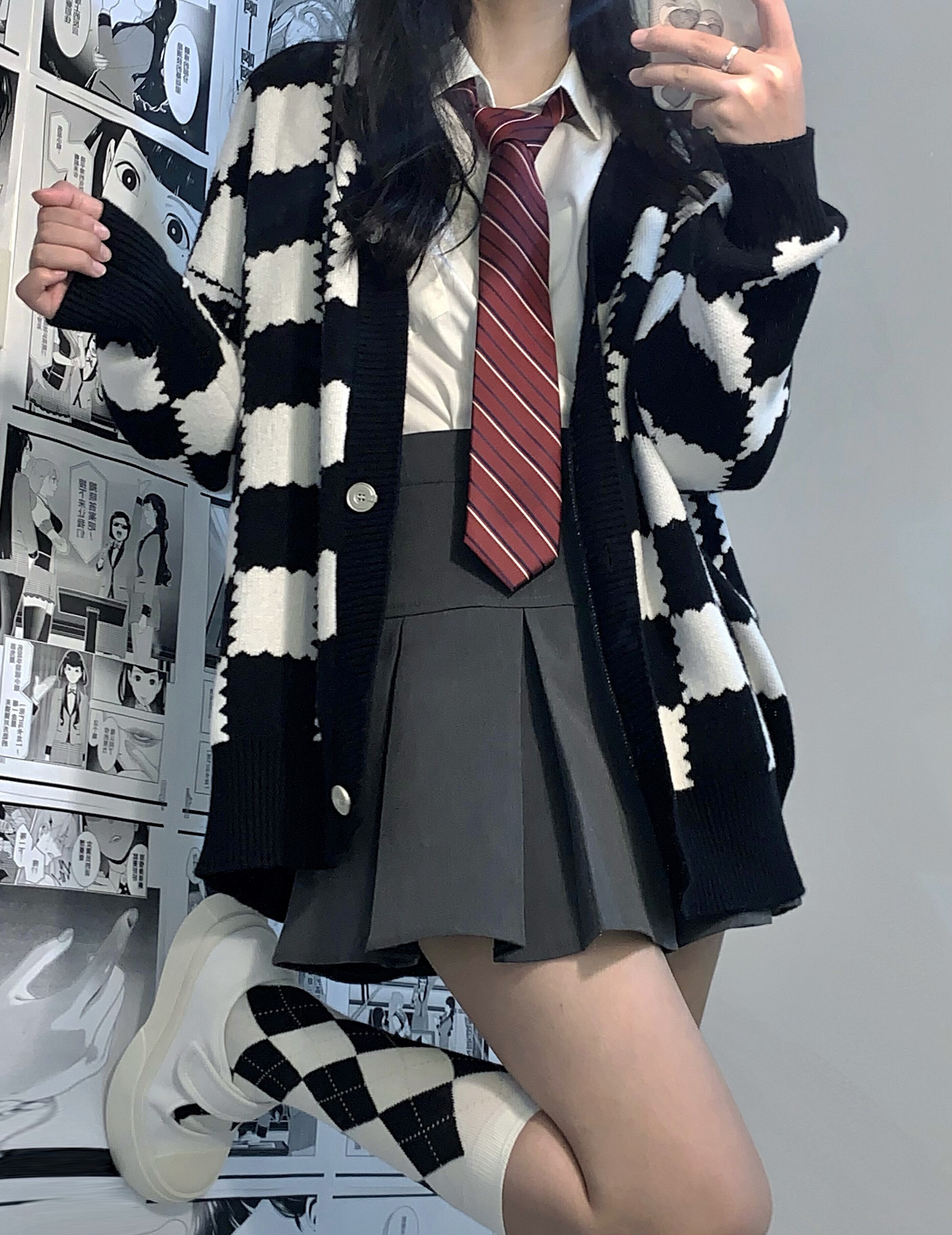 スタイルVネックセーター カーディガン格子柄オータムルーズジャケット ロング 秋物 kumikum97401309027