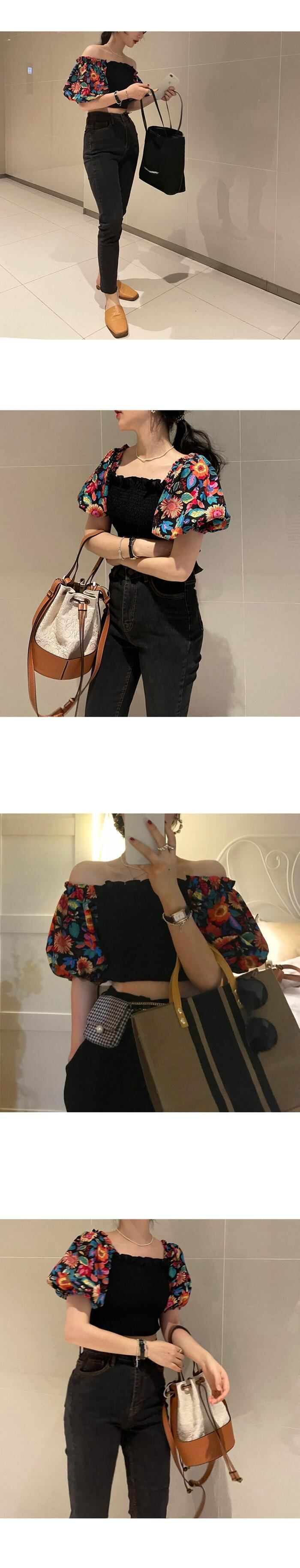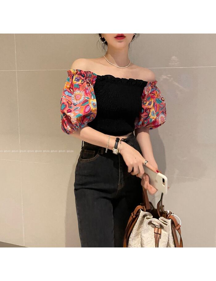 スタイルスタンダードスリーブフローラルシャツ レディースサマーカラープリーツクロップトップ トップス レトロ 夏物 花柄 オフショルダー kumikum54593877733
