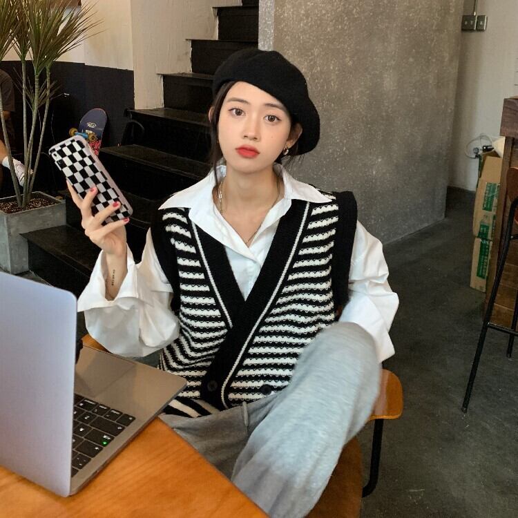 ルーズVネックノースリーブジャケット カラーストライプニットオータム 秋物 kumikum36120055967