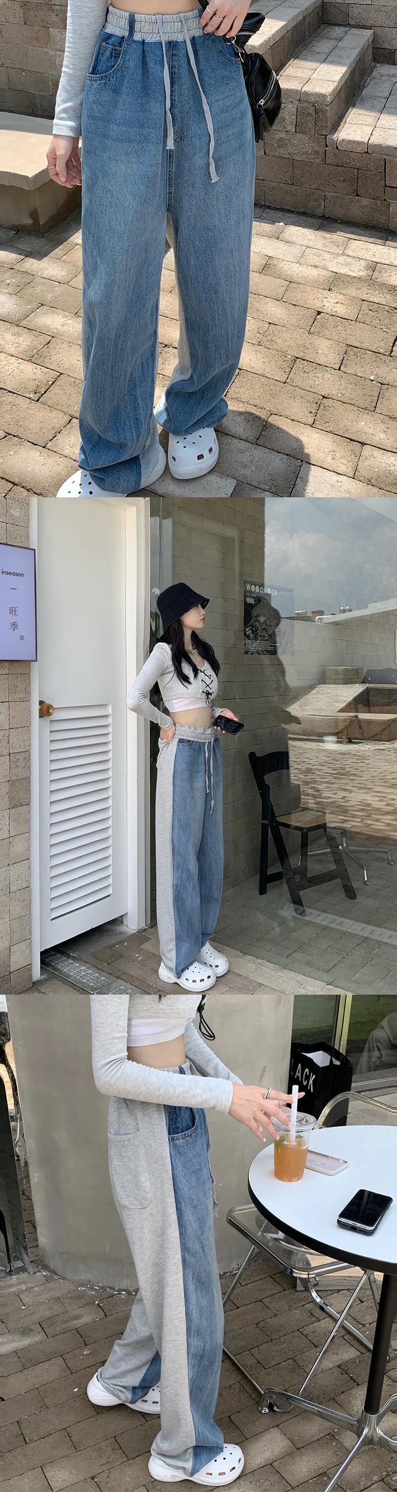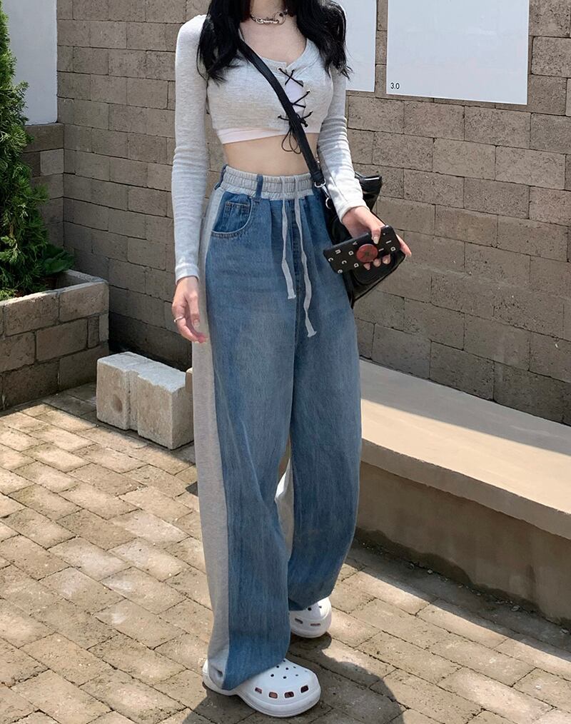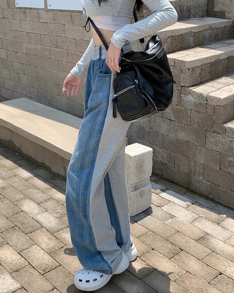 ジーンズ オータムストレッチウェスト薄手ワイドレッグパンツ エラスティック 伸縮 秋物 ワイドパンツ ステッチ kumikum63057820721