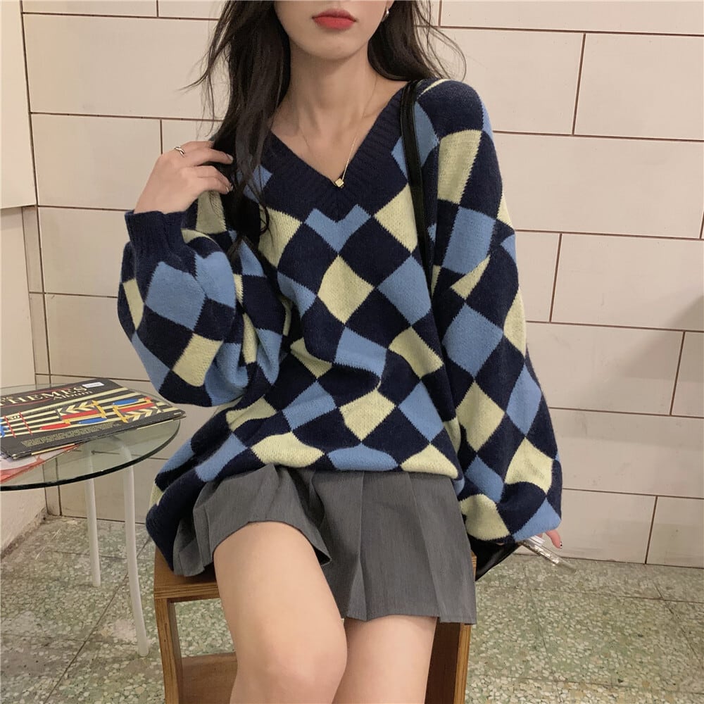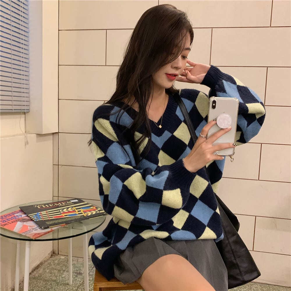 スタンダード格子柄セーター オータムVネックルーズトップス ロング レトロ 秋物 kumikum786055943