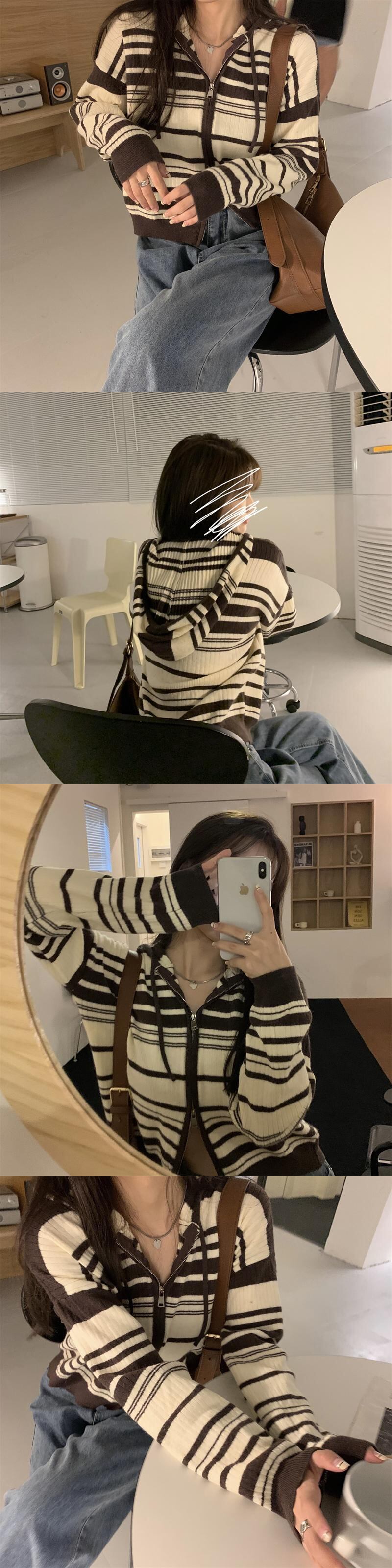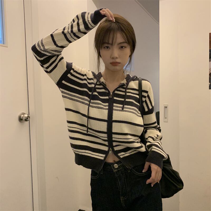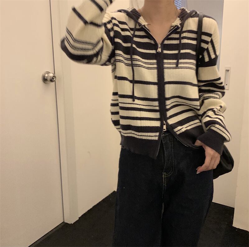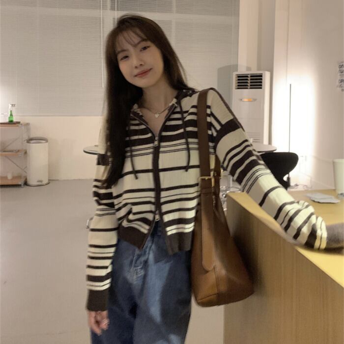 ストライプフードカーディガンセーター オータムスタイルジッパーニットトップス 秋物 kumikum48953842503