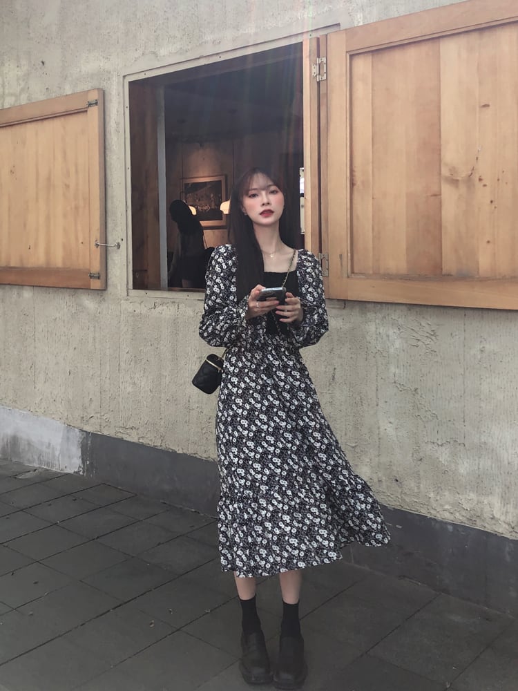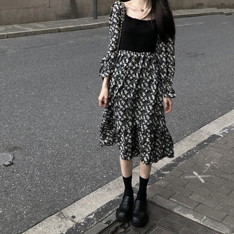 ウェスト薄手シフォンドレス レディースオータムトップス ロングフローラルスカート 秋物 花柄 ステッチ kumikum15371565619