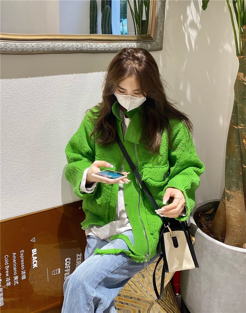 スタンダードグリーンセーター ジャケット レディーススタンドカラーカラーポケットニット長袖スリーブカーディガントップス ロング レトロ ウィンター 冬物 kumikum65087479402