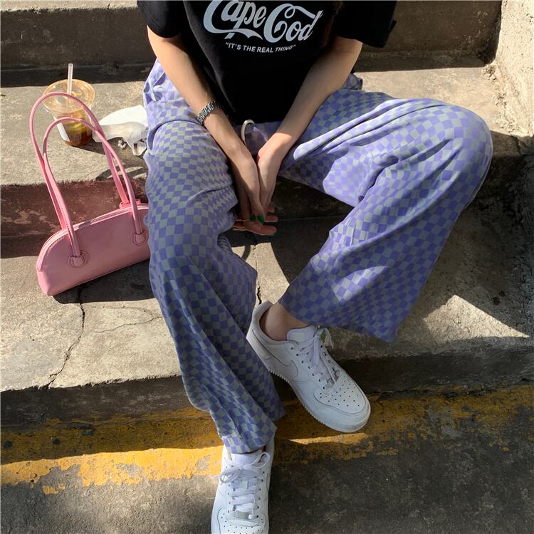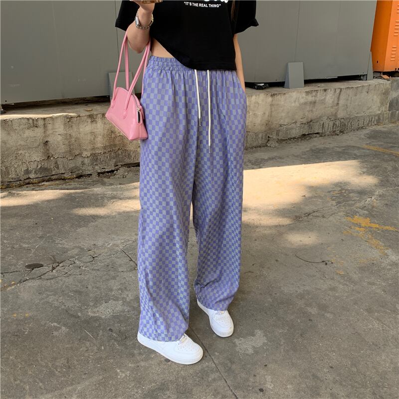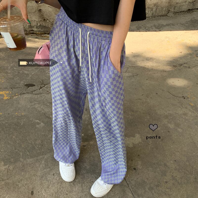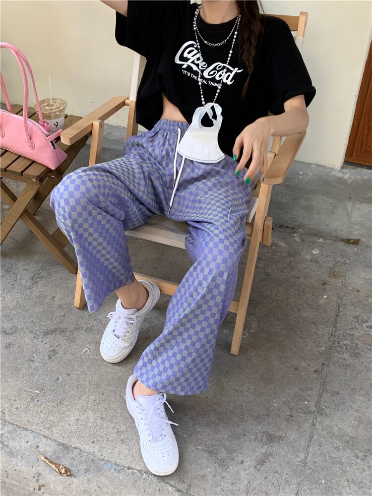 格子柄ワイドレッグパンツ レディースサマーハイウェストウェストカジュアルルーズ 夏物 ワイドパンツ kumikum44708507868