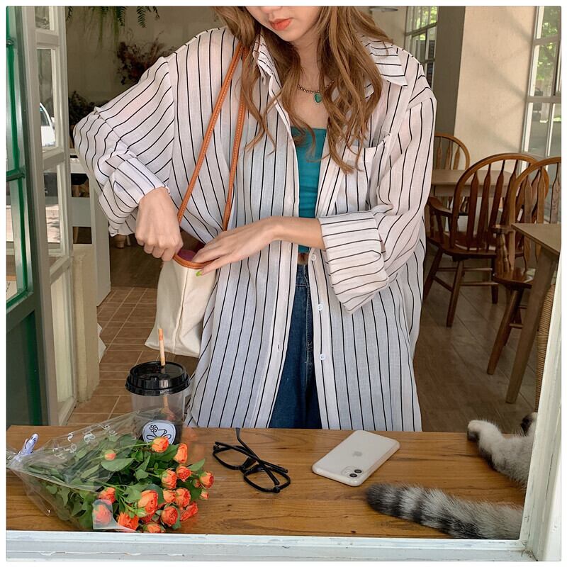 シャツ ストライプオータムスタイルルーズ薄手カーディガンジャケット ロング 秋物 kumikum31040636850