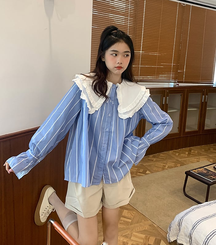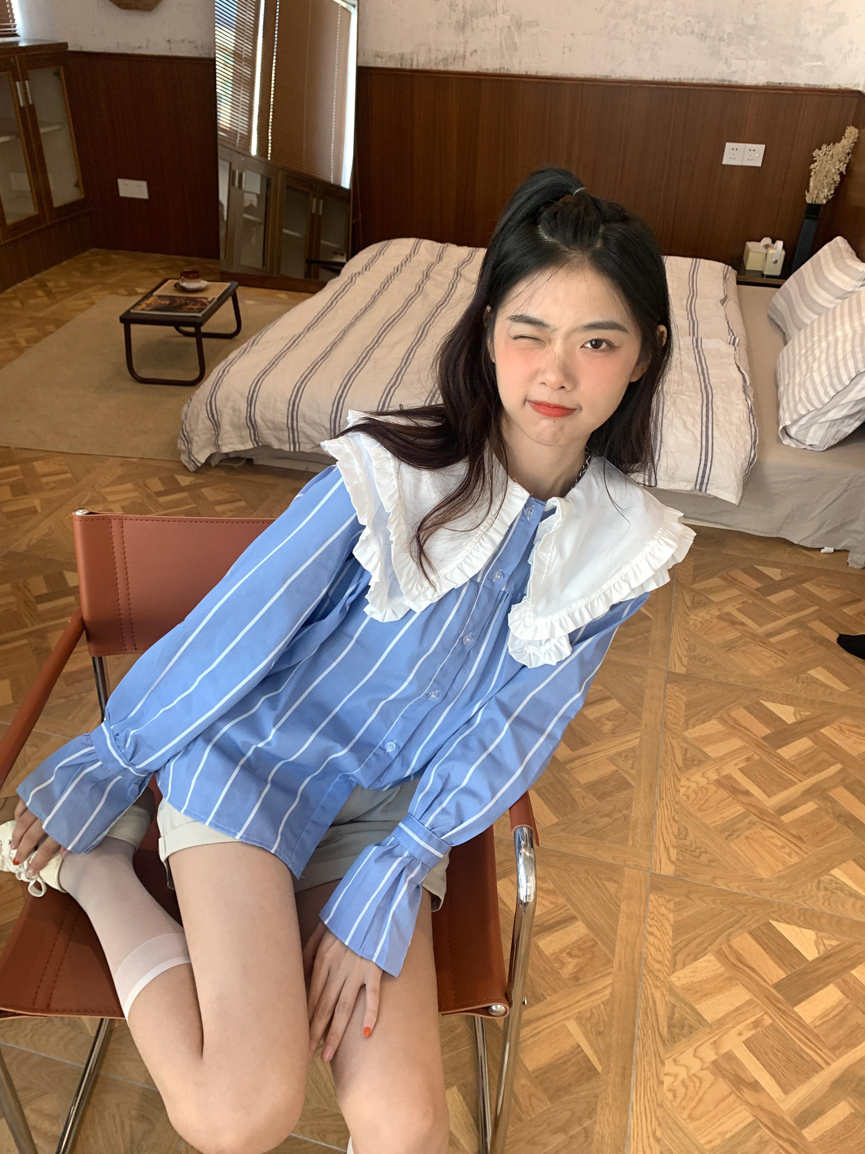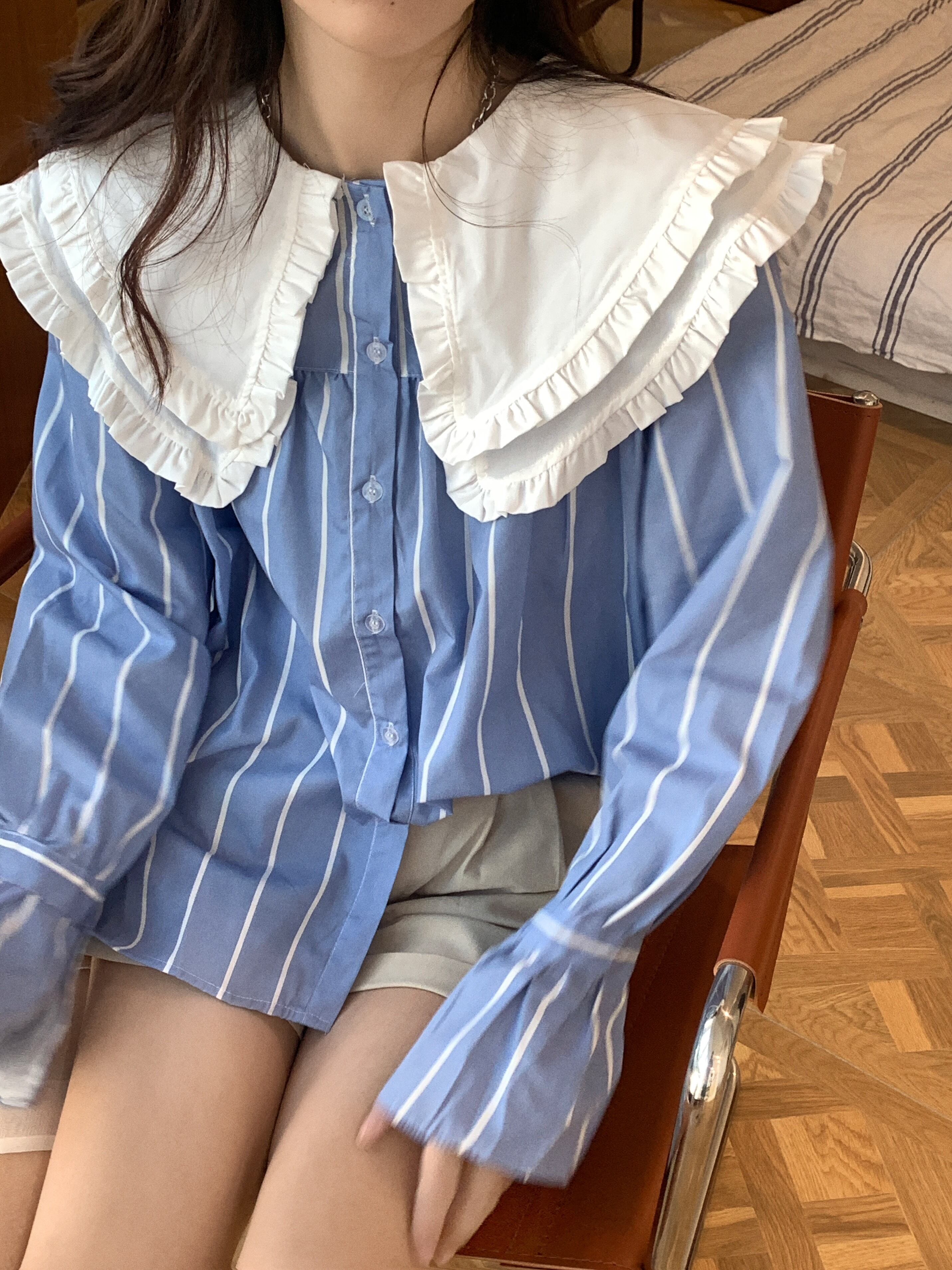 カラーストライプシャツ オータム長袖スリーブトップス ロング 大人ガーリー スウィート キュート カジュアル 秋物 kumikum18208597257