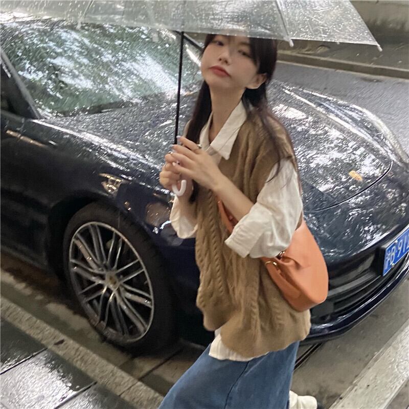 カーキニットレディースオータムスタンダードVネックノースリーブセーター レトロ 秋物 kumikum48143404725