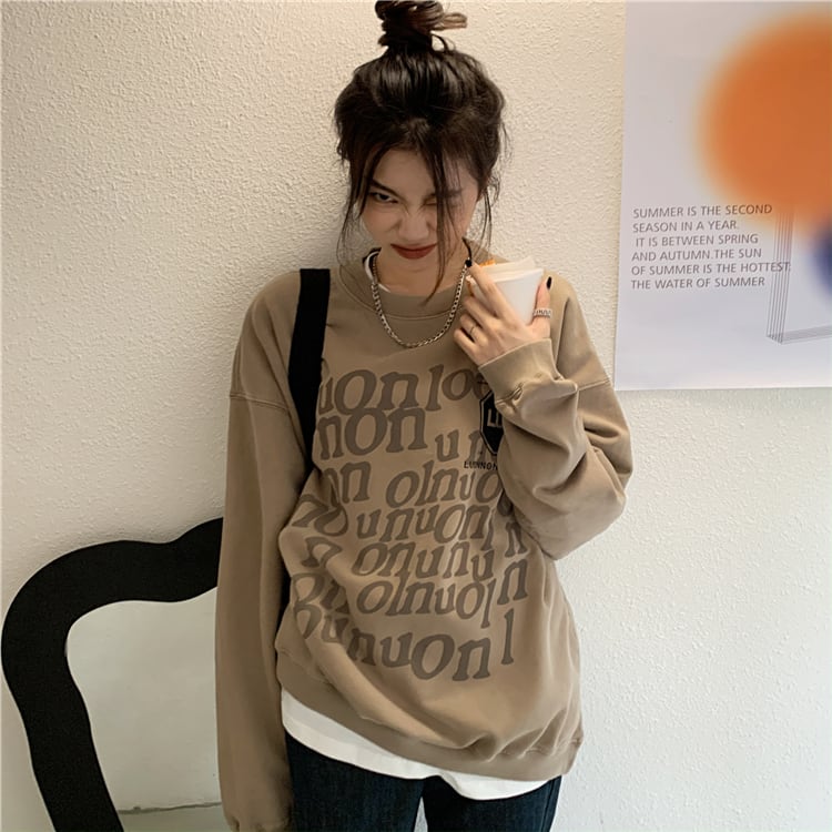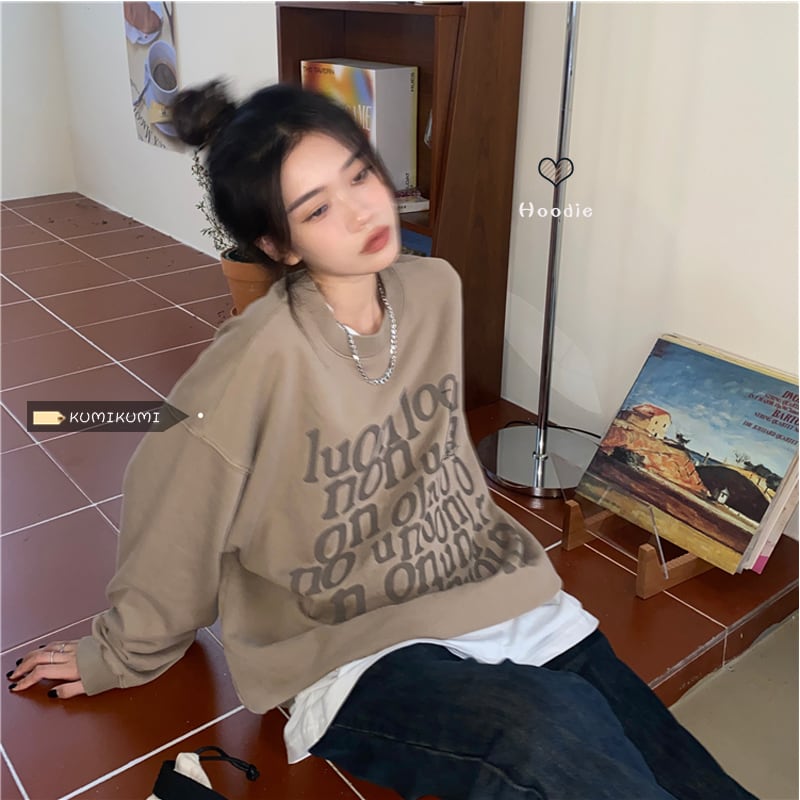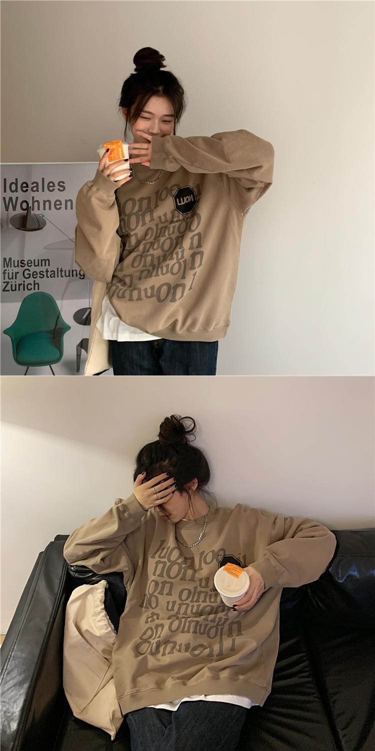 ルーズスタンダードプリント柄ラウンドネックオータムスタイルトップス ロング コットン レトロ 秋物 Oネック kumikum89791528011