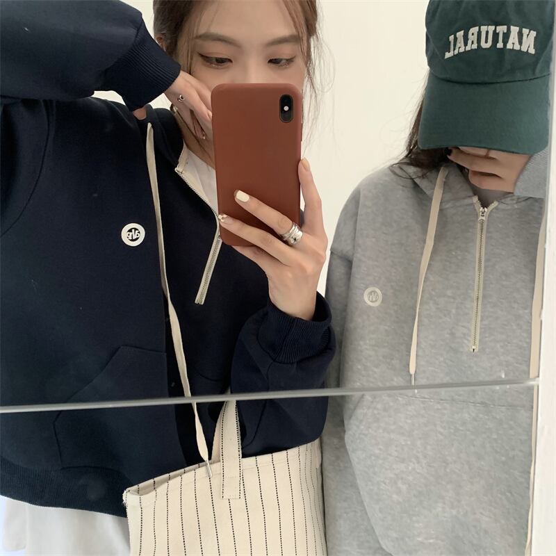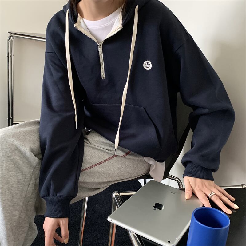 ソリッド カラーフードスウェット ルーズ刺繍オータムジャケット ロング 秋物 ソリッドカラー kumikum54100588058