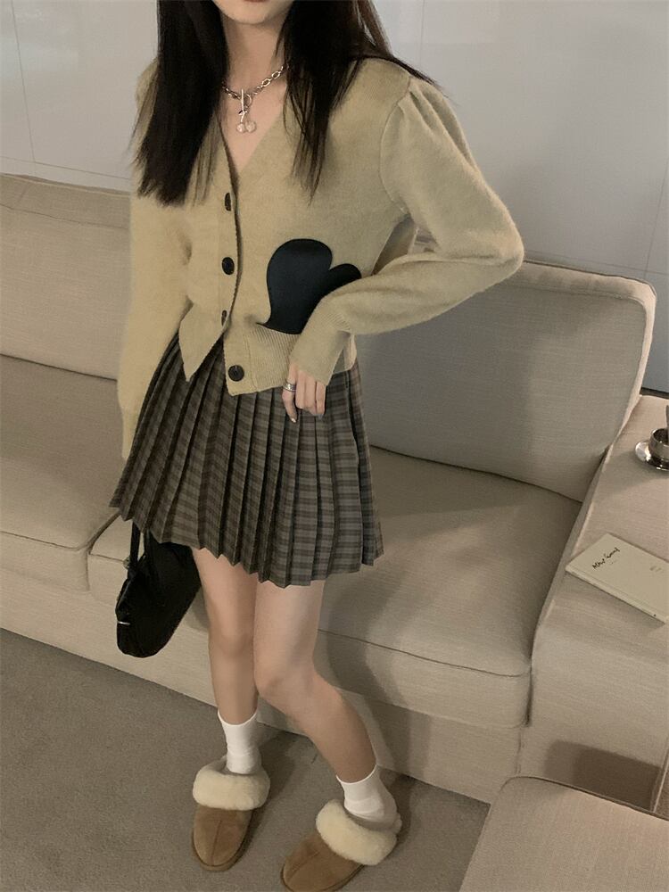 色:カーキカーディガン,白いカーディガン,ブラックカーディガン,カーキチェック柄スカート(S),ブルーチェック柄スカート(S),カーキチェック柄スカート(M),カーキチェック柄スカート(L),ブルーチェック柄スカート(M),ブルーチェック柄スカート(L)